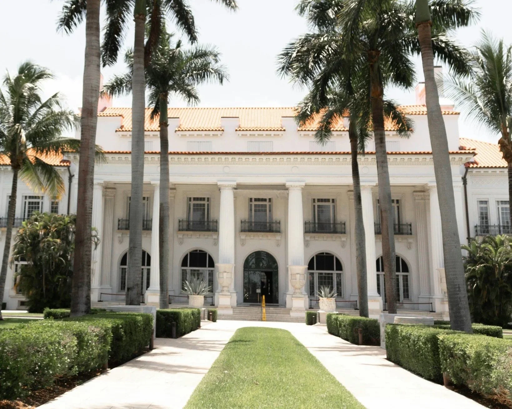 White Mediterranean-style mansion with tall columns, arched windows, and a terracotta tile roof, surrounded by palm trees and neatly manicured shrubbery.